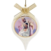 The Holy Family Ornament. On the back of the ornament: For this reason I bow my knees before the Father, from whom every family in heaven and earth is named. EPHESIANS 3:14-15